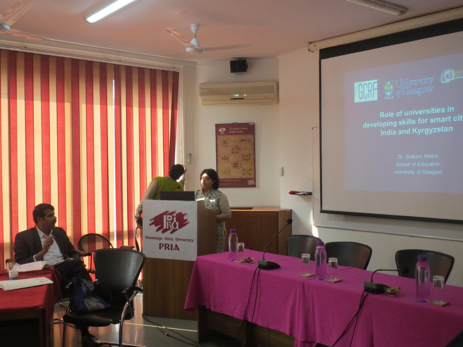 As part of a project entitled, The role of universities in developing skills for Smart Cities, funded by the Scottish Funding Council from its contribution to the University of Glasgow’s efforts to develop activities concerned with the Global Challenges Research Fund, a group of academics from the University of Glasgow (Dr Srabani Maitra, Professor Mike Osborne, Dr Seth Agbo) visited New Delhi to participate in a Roundtable hosted and organised by the Participatory Research in Asia (PRIA) organisation.