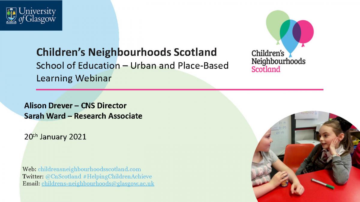 Dr Alison Drever, CNS Director and Dr Sarah Ward, Research Associate in CNS researchers in Children’s Neighbourhoods Scotland spoke to the work of this project funded by the Scottish Government as well as public and private, and which is working in high poverty neighbourhoods to improve outcomes for children and young people. They described the themes and work strands of the project with a particular emphasis on the role of children’s own voices in decision-making. The uniqueness of the CNS model lies in dialogue, the use of creative arts and games, its multi-dimensional approach, its scalability and it focus on a youth-led well-being framework and action plan. They also described the work of CNS in the context of the impact of COVID-19 on families, children and young people in Glasgow, and concluded with a brief account of the impacts of the work.