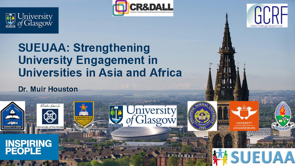 Dr Muir Houston, Co-I within the British Academy funded GCRF project, Strengthening Urban Engagement of Universities in Asia and Africa (SUEUAA) presented an account of the work of that project as it related to cities and infrastructure. He focused on the different ways in which universities engaged with their urban communities, and how they contribute to developing sustainable cities in the context of the major social, cultural, environmental and economic challenges facing the global south. He described the various methods used in the study undertaken in six global south countries and focused on the main themes of the project: migration; environment; economy; health; and policy.