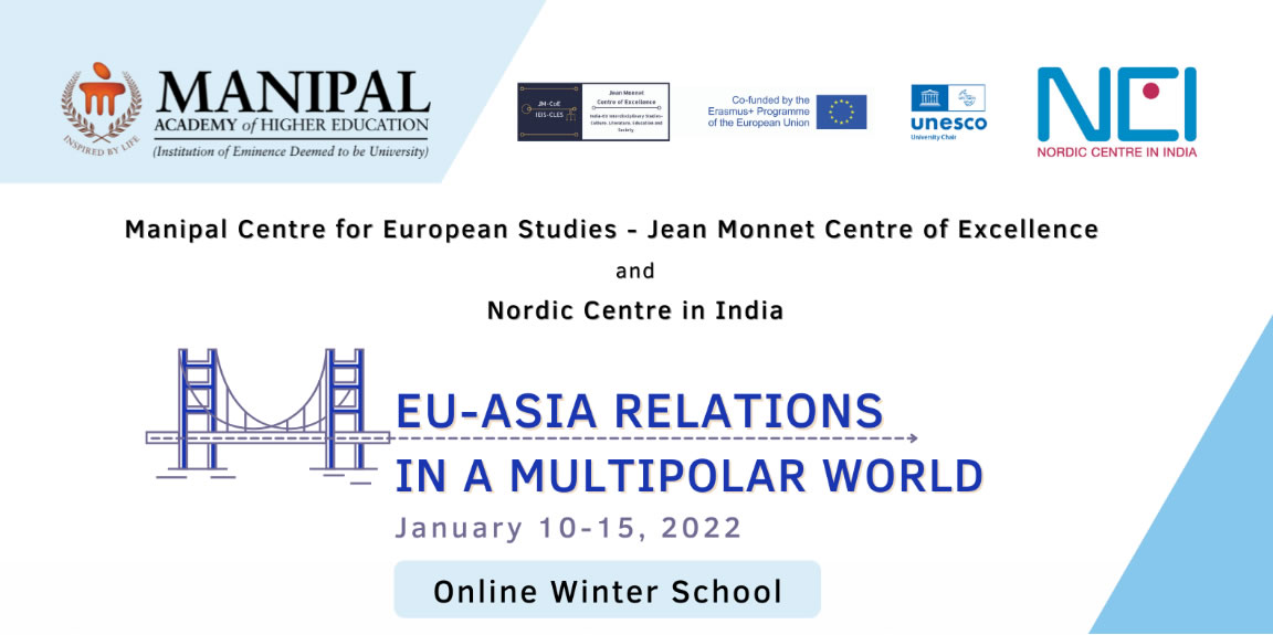 Greetings from the Manipal Centre for European Studies (MCES)! We are delighted to announce that MCES is organizing an Online Winter School on 'EU-Asia relations in a Multipolar World' under the Jean Monnet Centre of Excellence project and in collaboration with the Nordic Centre in India (NCI) from January 10-15, 2022.